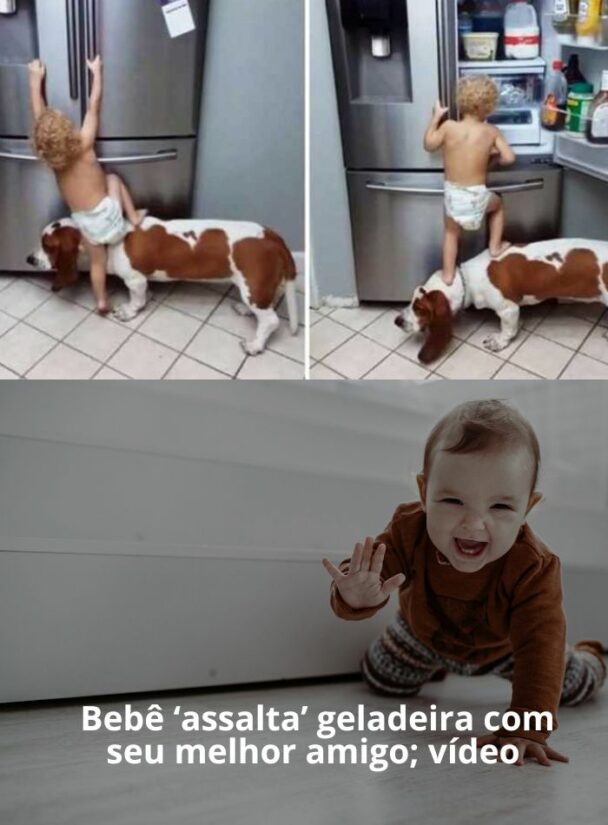 Bebê ‘assalta’ geladeira com seu melhor amigo; vídeo